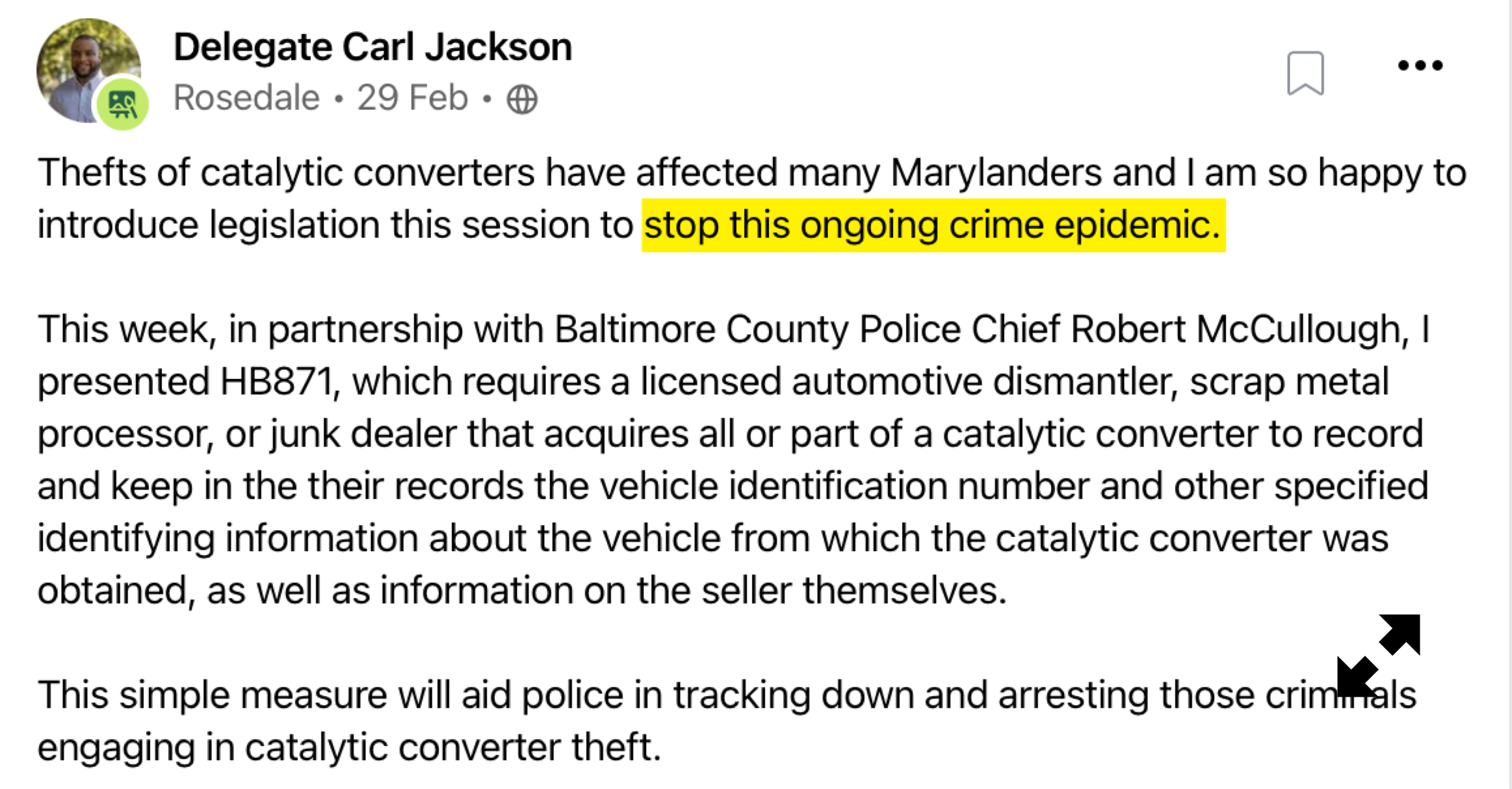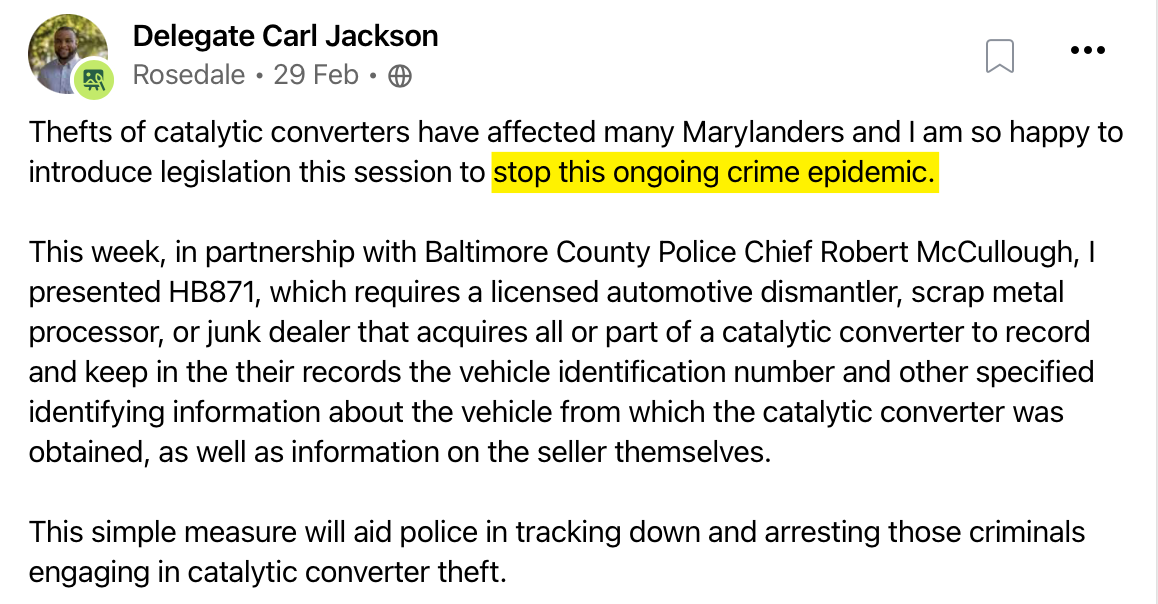 During this Legislative session, Delegate Carl Jackson sponsored HB0871, which mandates record-keeping for junk dealers, scrap metal processors, and automotive dismantlers/recyclers regarding catalytic converters. He claims on the social app Nextdoor that this will “stop this ongoing crime epidemic”. However, does anyone besides Delegate Jackson truly believe that imposing laborious record-keeping on law-abiding business owners with no way to punish offenders (many under 17) will reduce crime?