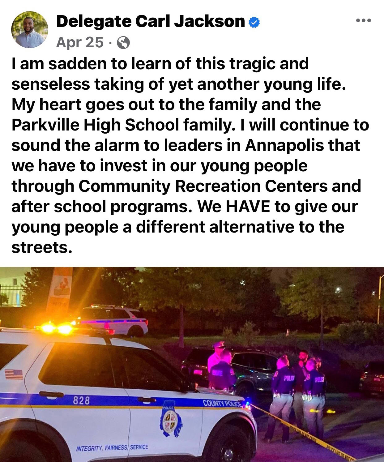 “I will continue to sound the alarm to leaders in Annapolis that we have to invest in our young people through Community Recreation Centers and after school programs. We HAVE to give our young people a different alternative to the streets.”