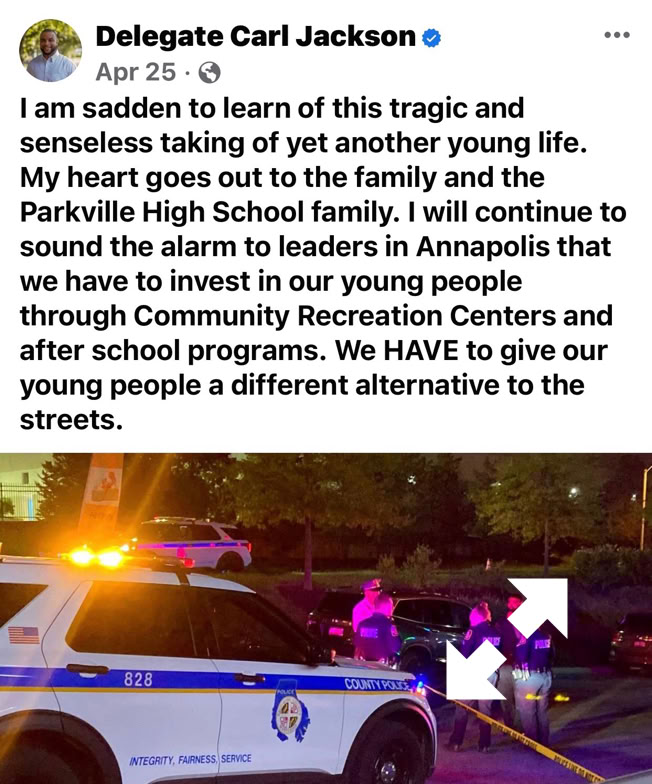 In 2023, following the robbery and murder of a Parkville High School student, Delegate Jackson took to Facebook to say,
